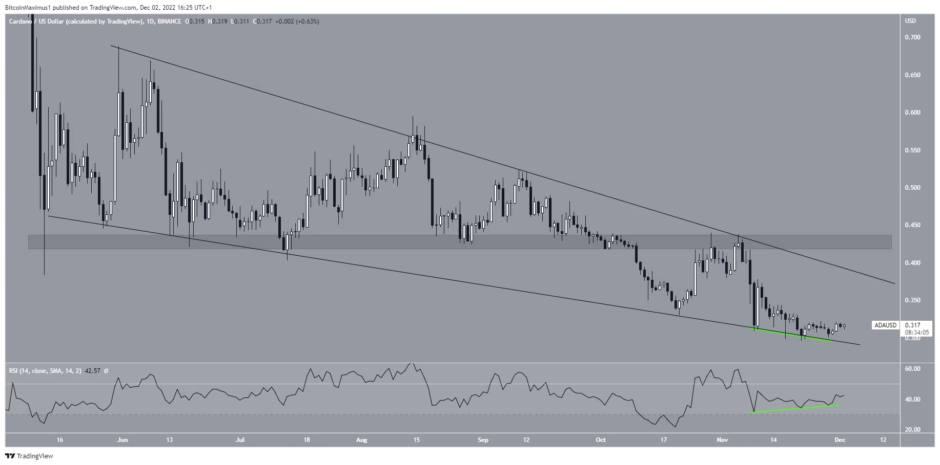 Khi di chuyển trong nêm này, giá ADA đã giảm xuống mức thấp nhất là 0.296 USD vào ngày 21/11. Từ ngày 8 đến ngày 28/11, giá đã 3 lần xác thực đường hỗ trợ của nêm trong khi chỉ báo RSI tạo phân kỳ tăng. Đây là một dấu hiệu tăng giá tích cực.