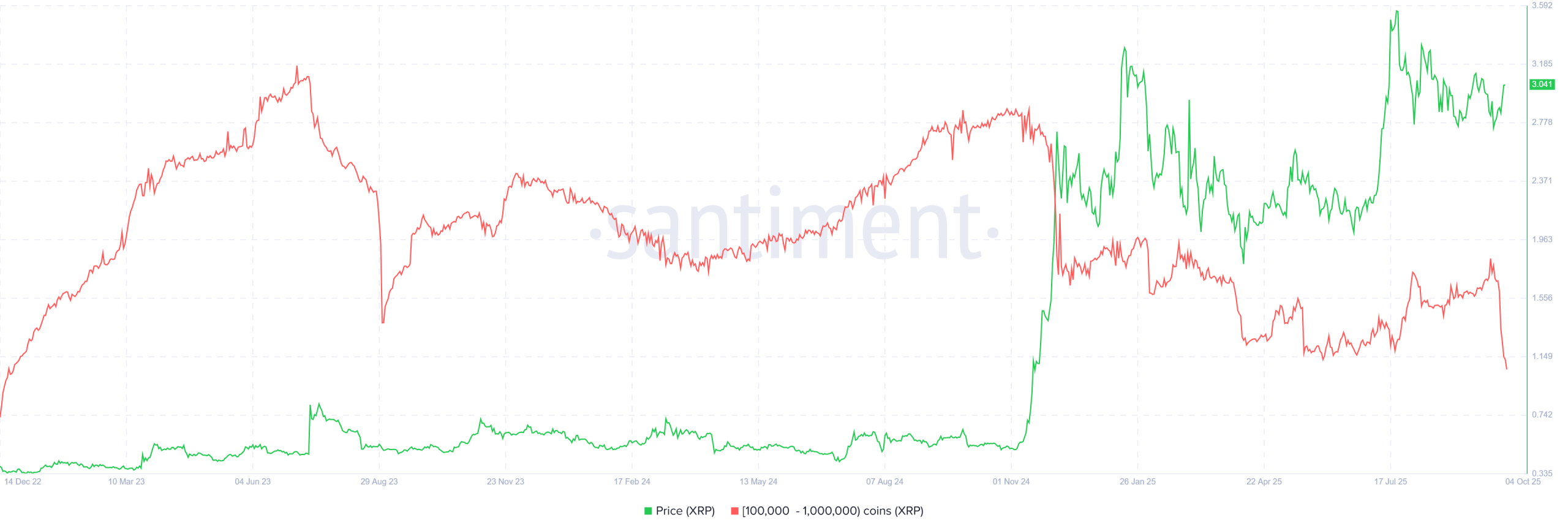 Các cá voi XRP đã bán tháo lượng nắm giữ của họ trong vài ngày qua, góp phần làm chậm giá. Các địa chỉ nắm giữ từ 100,000 đến 1 triệu XRP đã bán hơn 100 triệu token chỉ trong 10 ngày, cho thấy sự suy giảm đáng kể về niềm tin của các nhà đầu tư lớn.