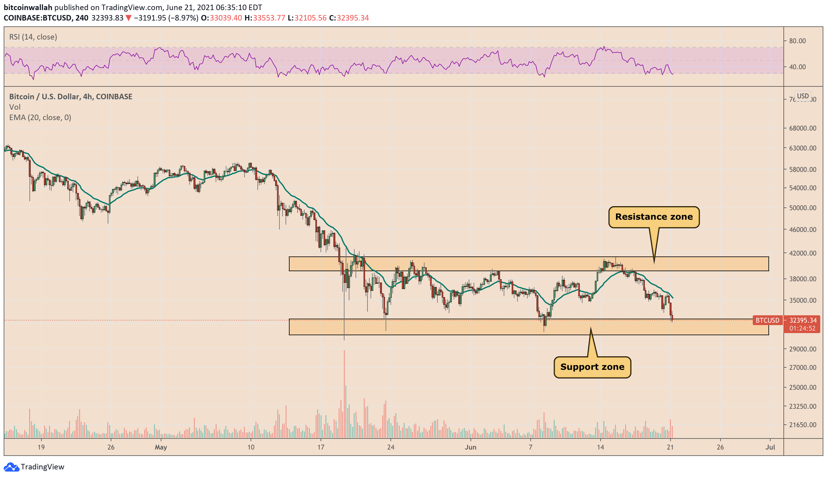 Tiền điện tử hàng đầu tiếp tục giảm giá trong phiên giao dịch ngày hôm nay, chạm mức 32,105 USD sau khi giảm khoảng 10% trong ngày. Khi làm như vậy, nó đã nâng cao triển vọng kiểm tra lại mức 30.000 USD.