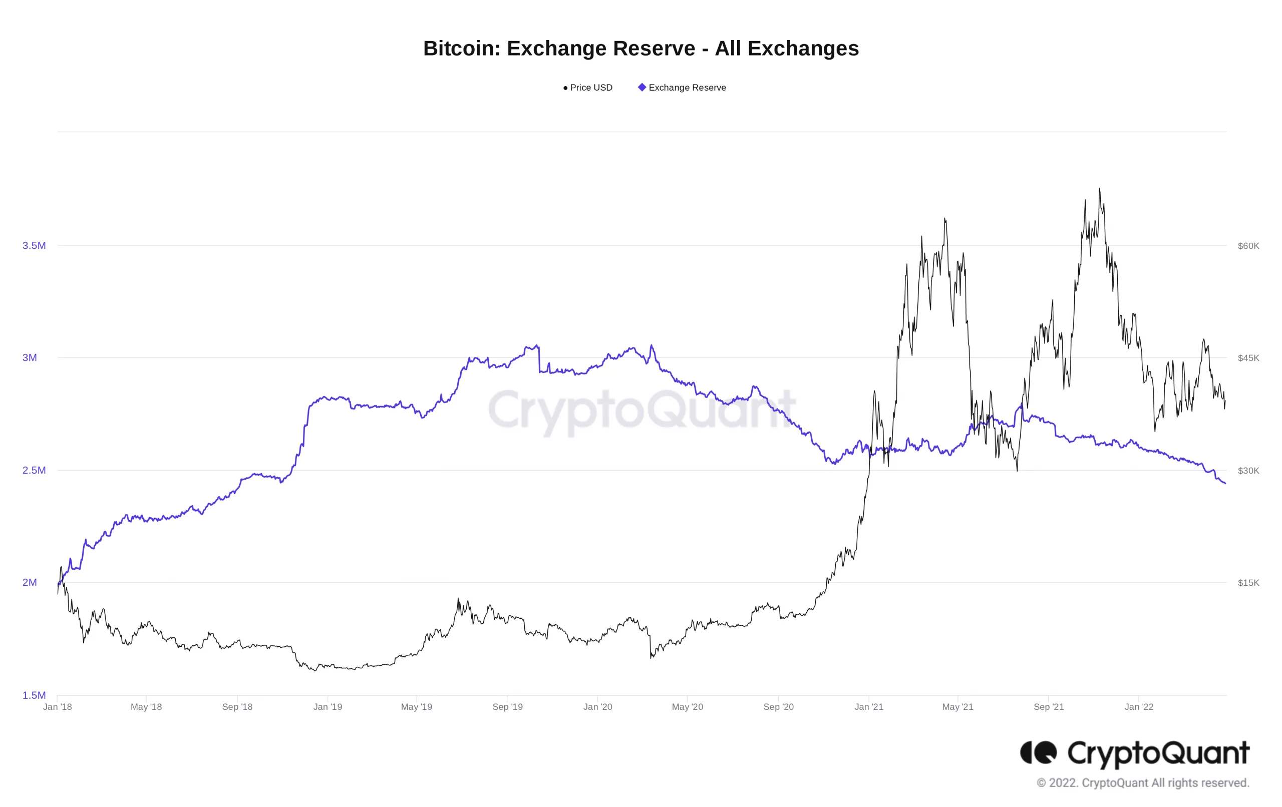 Trong khi đó, 21 nền tảng giao dịch được CryptoQuant theo dõi có lượng dự trữ BTC kết hợp thấp nhất kể từ tháng 9 năm 2018.