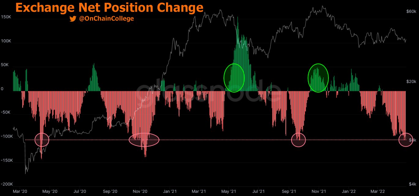 “Sự thay đổi trong 30 ngày của Số dư Bitcoin trên sàn giao dịch đang chạm mức tiêu cực mà chúng ta chỉ thấy một vài lần trong hai năm qua”, tài khoản Twitter On-Chain College viết cùng với biểu đồ chú thích về số liệu thay đổi vị trí ròng trên sàn giao dịch của Glassnode.