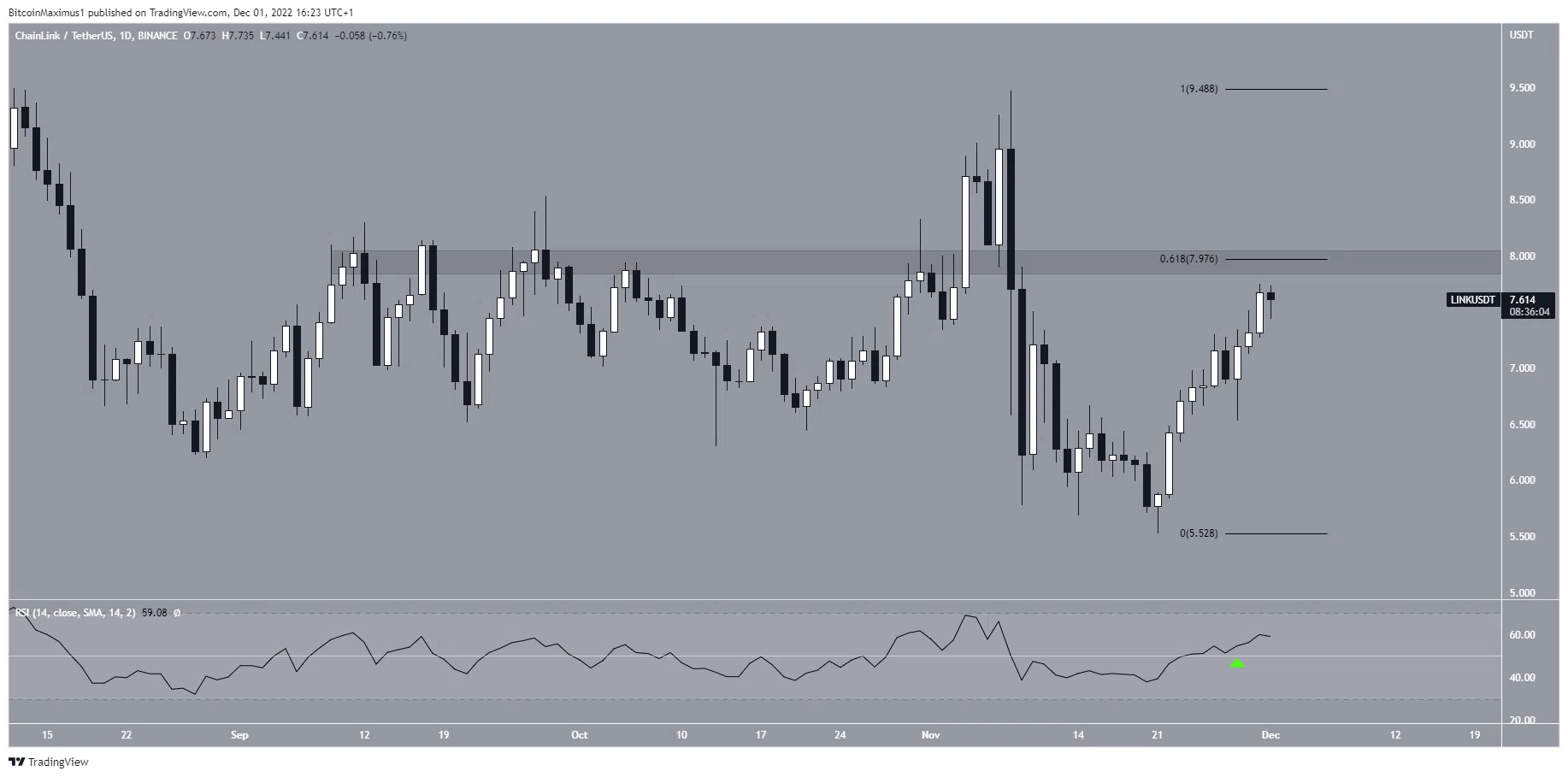 Phân tích kỹ thuật giá Chainlink từ khung thời gian hàng ngày cho thấy triển vọng tương đối lạc quan. Theo đó, LINK đã đạt mức cao nhất tại 7.62 USD, tiếp cận vùng kháng cự ngắn hạn ở mức 8 USD. Ngoài ra, sự phục hồi của đồng coin này kể từ ngày 21/11 cũng vượt trội hơn so với phần còn lại của thị trường tiền điện tử.