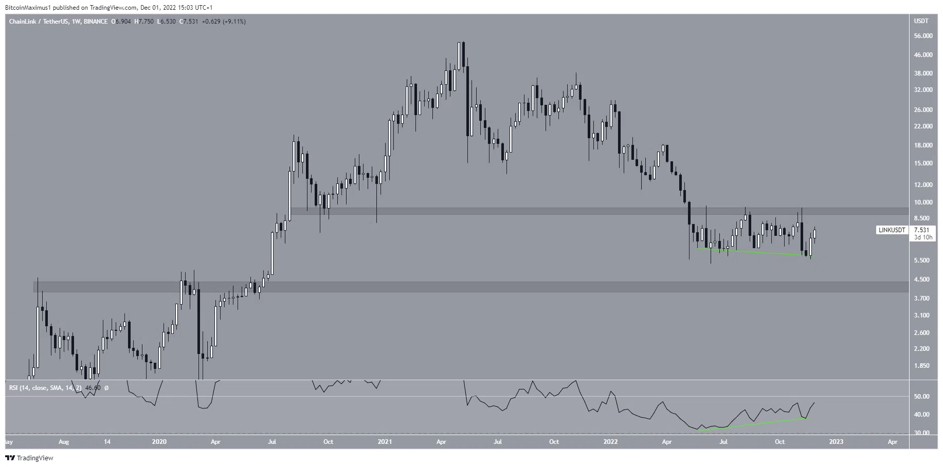 Mặc dù nằm dưới ngưỡng kháng cự, biểu đồ giá dường như không hoàn toàn là xu hướng giảm. Mỗi khi giá LINK giảm xuống dưới 6 USD, nó sẽ tạo ra các râu nến dài thấp hơn, được coi là dấu hiệu của áp lực mua. Trong đó, chỉ có một lần giá LINK đóng nến tuần dưới 6 USD và theo sau là một cây nến nhấn chìm đà tăng. Hơn nữa, chỉ báo RSI tuần đã tạo phân kỳ tăng. Đây là một dấu hiệu tăng tích cực cho việc giá LINK phục hồi trong tương lai.