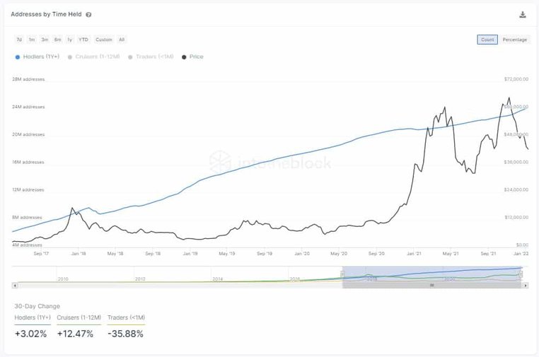 Trong trường hợp của Bitcoin, số lượng hodler đã tăng lên liên tục bất kể biến động giá, cố gắng tăng lên thông qua sự điều chỉnh gần đây và thậm chí qua sự sụp đổ mạnh mẽ đã trải qua vào tháng 3 năm 2020.