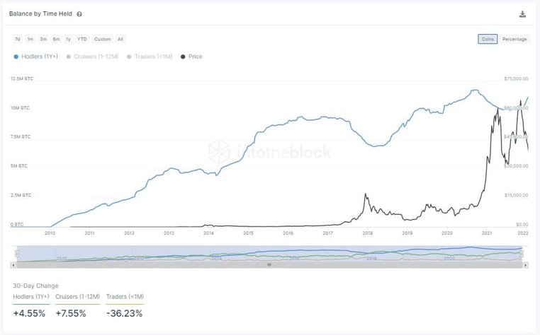 Dữ liệu từ IntoTheBlock phân loại hodlers là tất cả các địa chỉ đang nắm giữ tài sản trong thời gian trung bình có trọng số ít nhất một năm. Các nhà đầu tư dài hạn ngày càng tăng cho thấy niềm tin rằng một tài sản sẽ giữ nguyên hoặc tăng giá trị của nó theo thời gian, đây là đặc điểm chính của kho tài sản có giá trị.