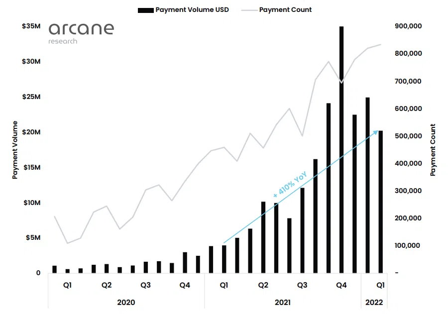 Khối lượng thanh toán qua LN thật sự bùng nổ vào năm 2021 trong khi một năm trước đó người ta vẫn còn rất dè dặt. Sự bùng nổ này kéo đến đỉnh điểm vào quý 4/2021 (tăng 7 lần) và tiếp tục duy trì trong quý 1/2022. Khối lượng qua LN hiện đã tăng 4 lần và số lượng thanh toán qua LN vẫn tăng rất đều.