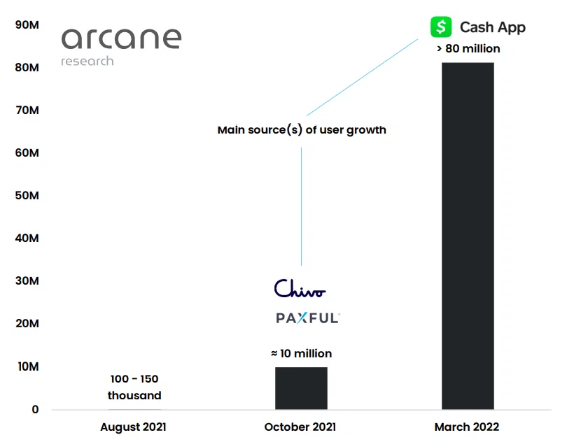 Chỉ từ chưa đến 150,000 người dùng hồi tháng 8/2021, nhưng cho đến nay đã có đến 80 triệu người dùng sẵn có để sử dụng thanh toán qua LN. Cùng với làn sóng Bitcoin Adoption hiện tại, sự tăng trưởng có thể sẽ chưa dừng lại.