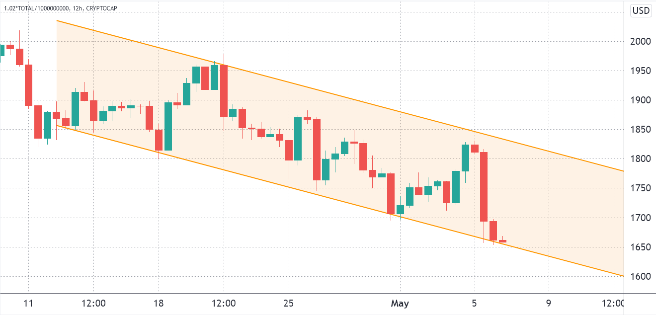 Tổng vốn hóa thị trường tiền điện tử đã được giao dịch trong một kênh giảm dần trong 24 ngày và mức hỗ trợ 1,65 nghìn tỷ USD đã được kiểm tra lại vào ngày 6 tháng 5. Sự sụt giảm xuống 1,65 nghìn tỷ USD theo sau là Bitcoin (BTC) đạt 35,550 USD, mức giá thấp nhất trong 70 ngày.