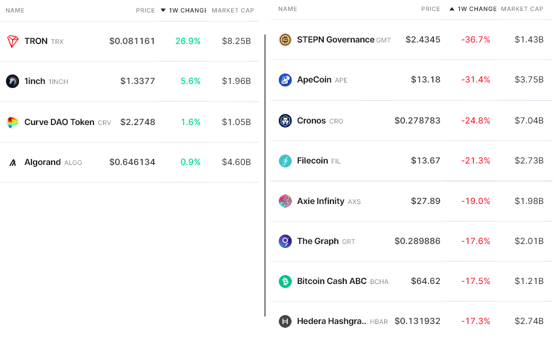 STEPN (GMT), token gốc của ứng dụng lối sống kiếm tiền phổ biến, đã giảm 35,7%, điều chỉnh sau khi tăng 70% từ ngày 18 tháng 4 đến ngày 28 tháng 4. Một chuyển động tương tự đã xảy ra với Apecoin (APE) sau khi token này được bơm 94% trong khoảng thời gian từ ngày 22 tháng 4 đến ngày 28 tháng 4.