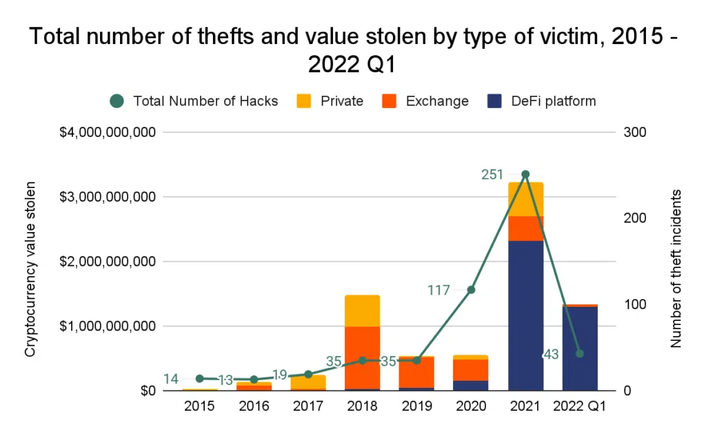 Chỉ riêng trong Q1/2022 mà số tiền thiệt hại từ các vụ hack đã gần bẳng 1/2 của cả năm 2021. Trong đó, không gian DeFi bị hack chủ yếu. Hoàn toàn ngược lại với tình trạng từ 2020 về trước, khi đó các vụ hack ít thiệt hại hơn mà chủ yếu là hack sàn hay hack ví riêng.