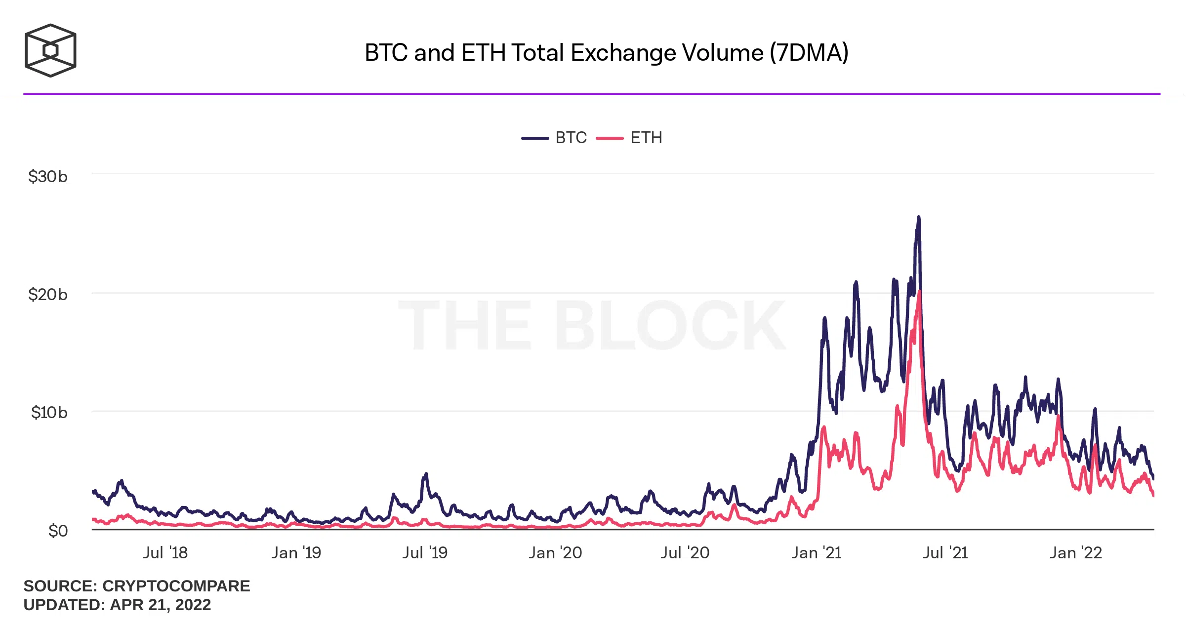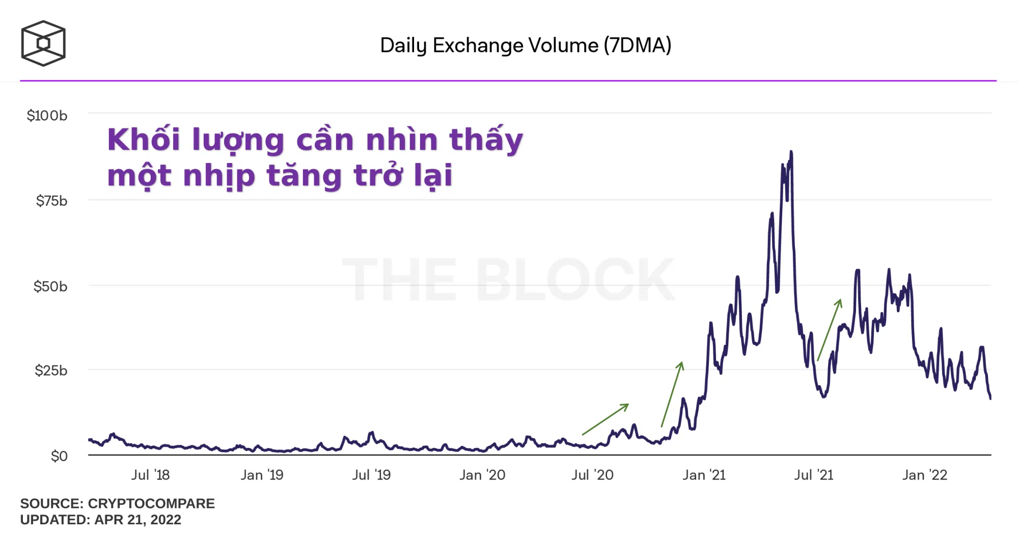Biểu đồ trên xét riêng khối lượng của Bitcoin và Ethereum. Có một điều khá kỳ lạ, đó là giá của tháng 3-4/2022 có sự phục hồi và suy giảm đáng kể nhưng lại không thể hiện khối lượng đột biến nào. Vậy ai đã bán? Câu trả lời khả năng cao là: thị trường chỉ còn lại những cuộc ngã giá và giao dịch giữa các quỹ lớn hay cá voi, những nhà đầu tư nhỏ lẻ trên sàn chỉ đang cầm cự.