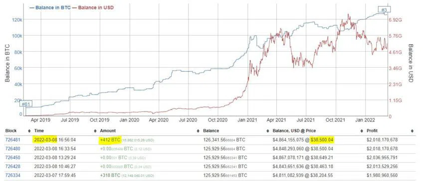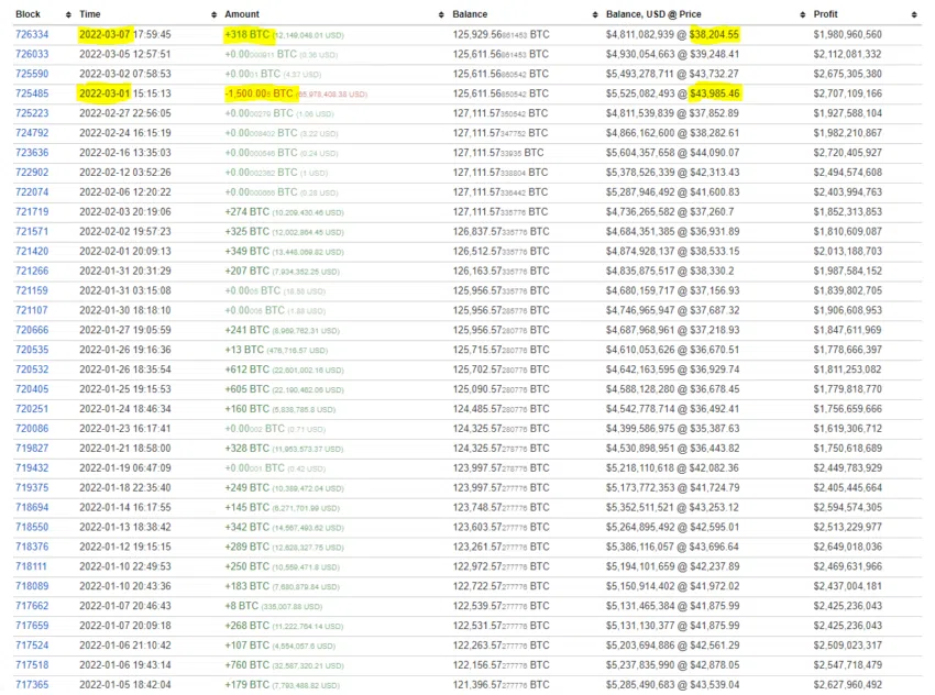 Đến ngày 7/3, khi Bitcoin khung 4h tạo một nhịp giảm về vùng 37,000 USD thì ví cá voi này cộng thêm 318 BTC. Sang ngày 8/3 giá Bitcoin bật lên trở lại 39,000 USD. Chưa hết, mời bạn xem tiếp lịch sử giao dịch 2 ngày gần đây.