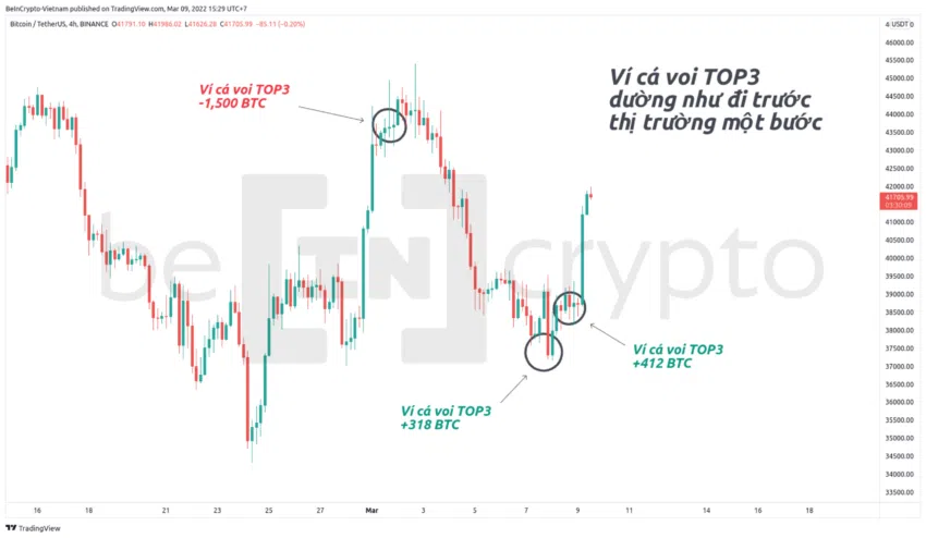 Cho đến cuối ngày 8/3 thì ví cá voi này cộng thêm hơn 412 BTC. Sang ngày 9/3, tức hôm nay, thị trường thể hiện sự phục hồi trở lại lên vùng 41,700 USD.
