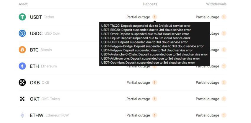 Tính đến thời điểm viết bài, trang trạng thái OKX cho thấy rằng sàn giao dịch không xử lý tiền gửi hoặc rút tiền trên nền tảng của nó. Theo sàn giao dịch, các dịch vụ này đã bị đình chỉ do “lỗi dịch vụ đám mây thứ 3”.