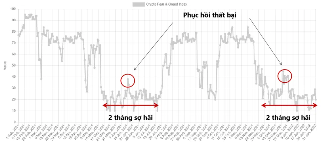 Lịch sử biến động của thước đo tâm lý tham lam và sợ hãi cho thấy 2 tháng là khoảng thời gian đủ dài cho kỳ vọng phục hồi trở lại. Nhiều chỉ báo khác cũng ủng hộ dự đoán này.