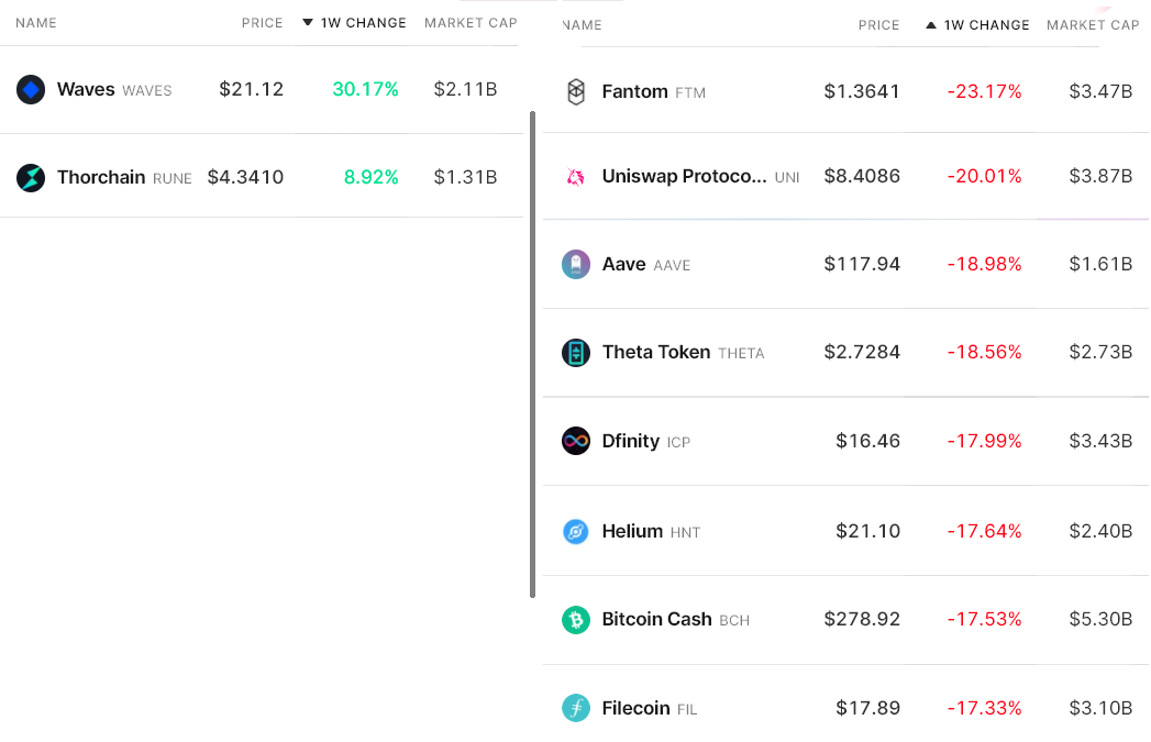 Chỉ có hai token có thể thể hiện hiệu suất tích cực trong bảy ngày qua. WAVES tăng trong tuần thứ hai liên tiếp khi nâng cấp mạng để trở thành nâng cao tương thích với Máy ảo Ethereum (EVM). Quá trình chuyển đổi dự kiến bắt đầu vào mùa xuân và cơ chế đồng thuận mới sẽ cung cấp “quá trình chuyển đổi mượt mà hơn sang Waves 2.0”.