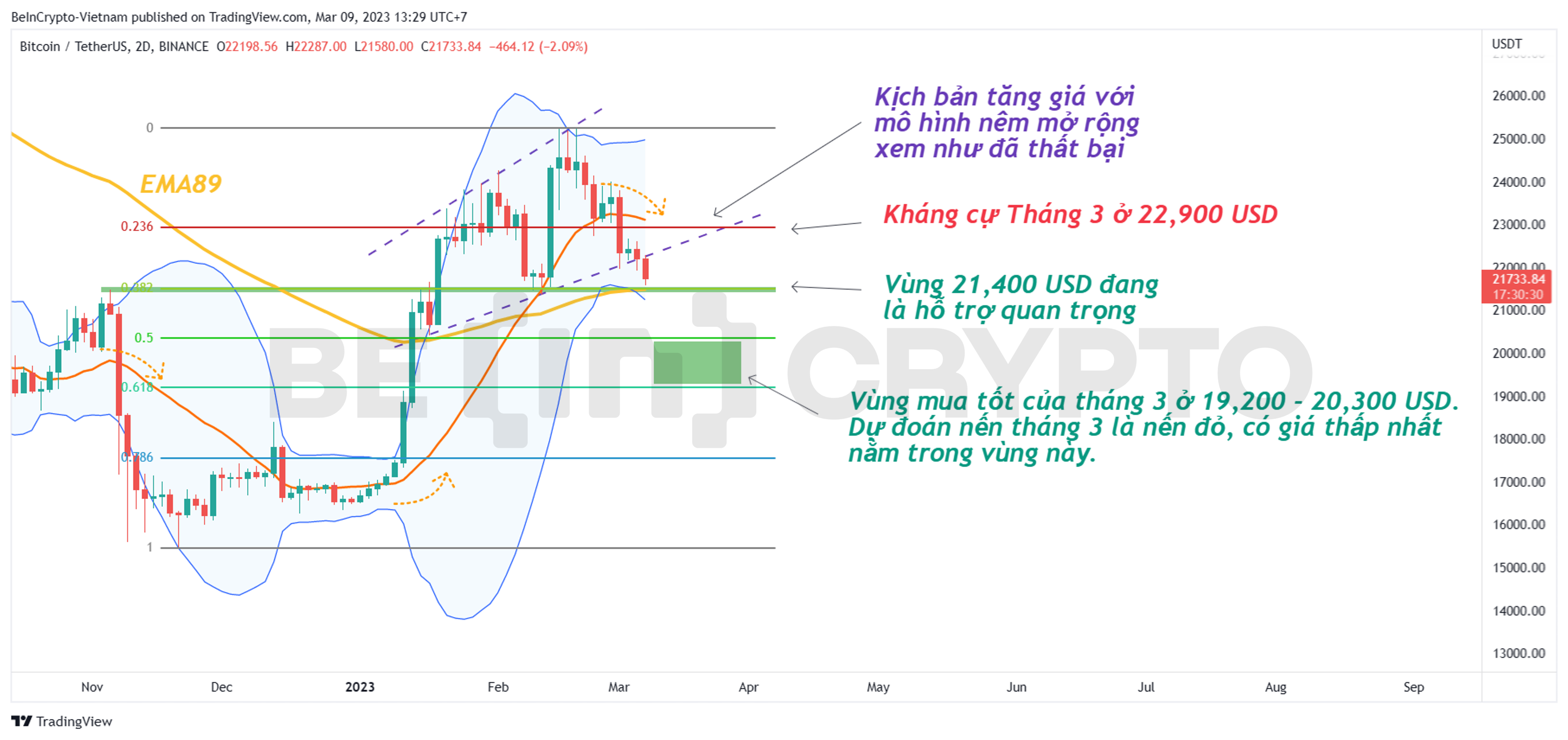 Nếu giao dịch ngắn hạn cần cắt lỗ dưới 21,400 USD và chốt lời tại 22,900 USD. Nếu giao dịch trung hạn cho đến tháng 4, có lẽ các trader cần chờ đợi một nến đỏ tháng 3 đạt đến vùng mua ở 19,200 USD – 20,300 USD.