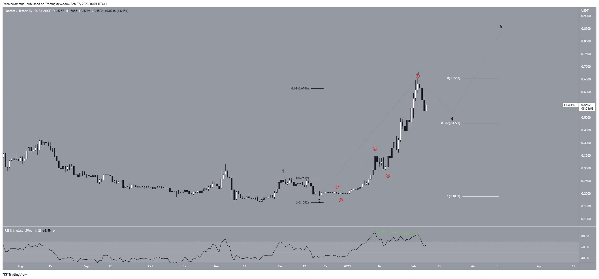 Nếu vậy, mức hỗ trợ thoái lui Fib 0.382 ở 0.46 USD (màu trắng) sẽ là mức đầu tiên có thể cung cấp hỗ trợ. Tuy nhiên, nếu FTM tăng trên mức cao nhất của sóng ba là 0.66 USD, dự báo giảm giá này sẽ bị mất hiệu lực. Trong trường hợp đó, FTM có thể tăng thêm tới 1.20 USD.