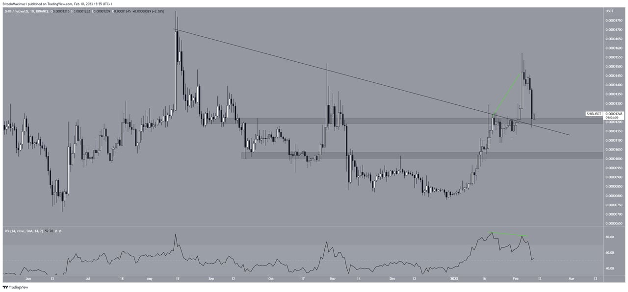 Sau khi đột phá, chỉ số RSI hàng ngày tạo ra sự phân kỳ giảm giá trong vùng quá mua. Hơn nữa, giá mã thông báo Shiba Inu đã hình thành một thanh nến có bóng nến bấc dài phía trên. Sau đó, mức giảm tiếp theo tăng nhanh vào ngày 09/2. Hiện tại, giá mã thông báo SHIB đang giao dịch trong khu vực 0.0000120 USD một lần nữa sau đó xác nhận đây là mức hỗ trợ. Vì khu vực này cũng trùng với đường kháng cự giảm dần nên điểm hợp lưu này là một mức quan trọng.