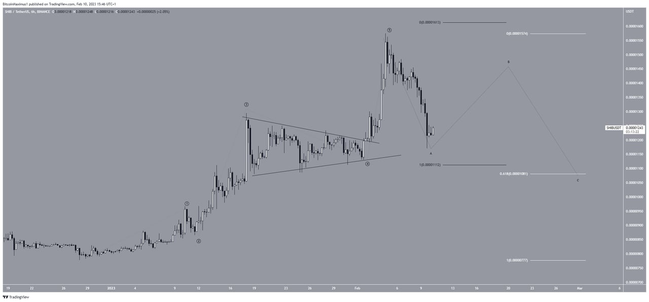 Phân tích kỹ thuật từ khung thời gian ngắn hạn 6 giờ cho thấy giá SHIB đã hoàn thành chuyển động đi lên gồm 5 sóng dẫn đến mức cao 0.0000157 USD. Đặc điểm nhận biết của động thái này là hình tam giác cũng là một phần của sóng bốn. Hơn nữa, sóng 5 mở rộng và có độ dài bằng sóng 1 và sóng 3 cộng lại (màu đen).