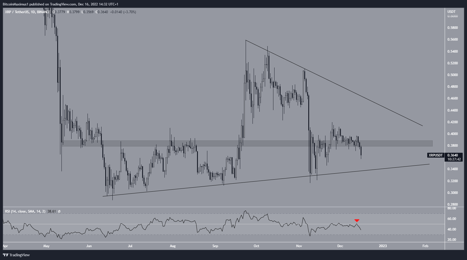 Do đó, phân tích giá XRP của chúng tôi đưa ra dự đoán có khả năng nhất là giá giảm xuống đường hỗ trợ của tam giác. Nếu mức đóng nến ngày trên 0.385 USD sẽ làm mất hiệu lực giảm giá này.
