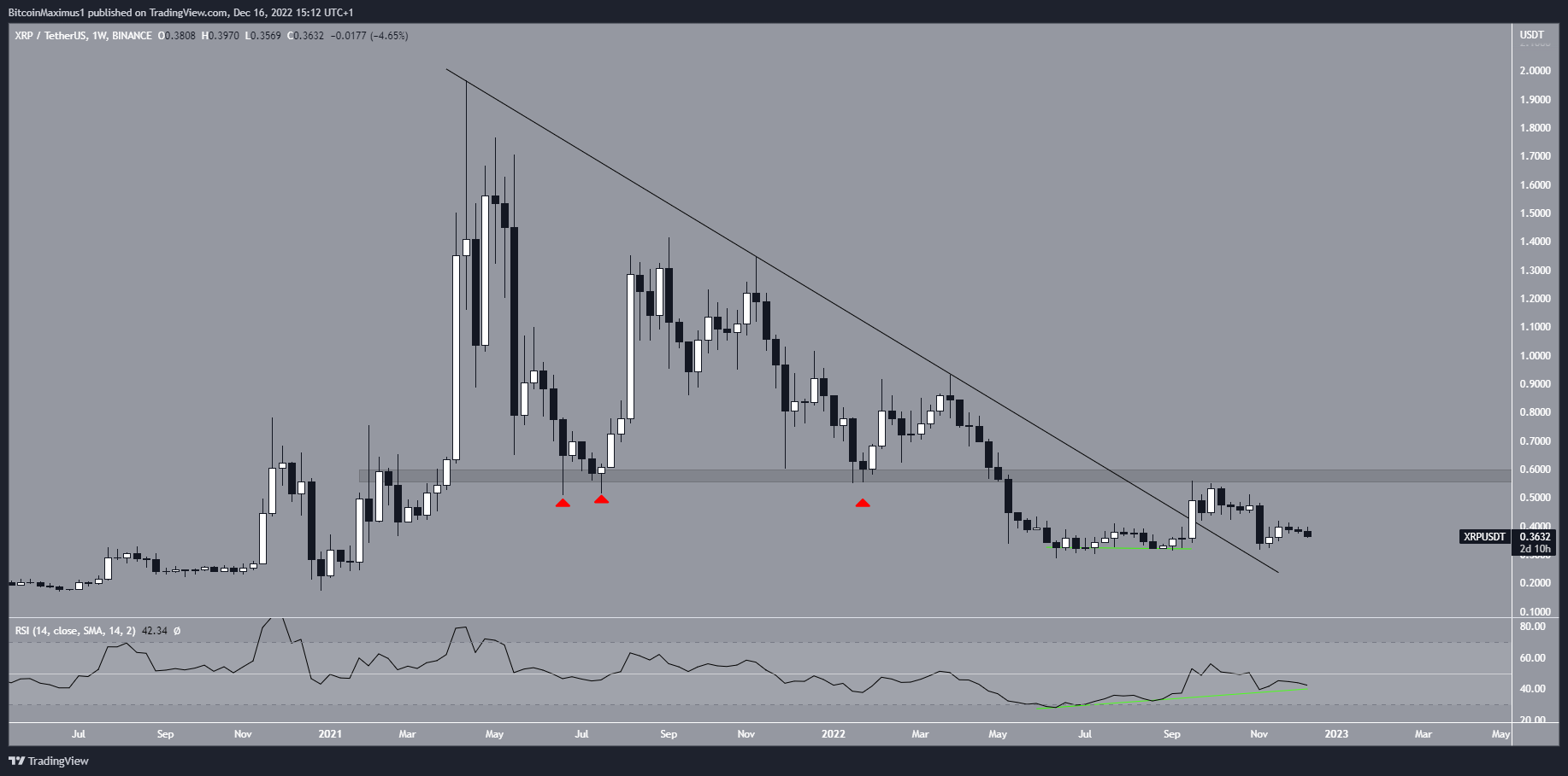 Bất chấp xu hướng giảm từ khung thời gian hàng ngày, cấu trúc tăng giá trong khung thời gian hàng tuần vẫn còn được duy trì. Phân tích giá XRP cho thấy nó đã đột phá khỏi đường kháng cự giảm dần dài hạn và xác nhận đây là hỗ trợ sau đó.