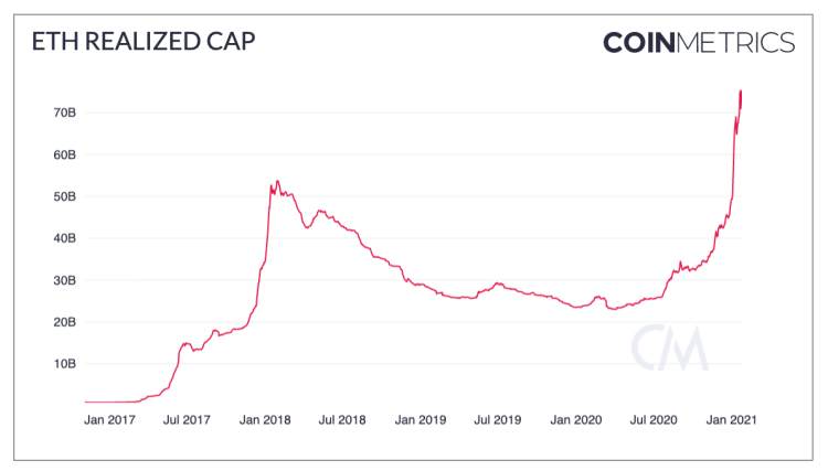 “Realized Cap” của Ethereum đã tăng gần 50% vào tháng 1 cho đến nay, đạt mức cao mới mọi thời đại trên 70 tỷ đô la, theo CoinMetrics.