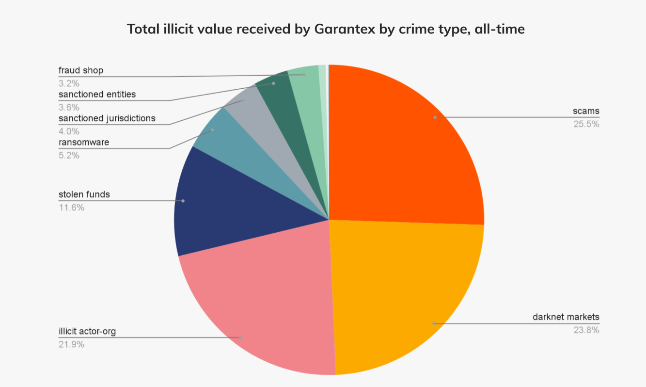 Trước đây, Chainalysis đã xác định rằng Garantex nhận được tiền từ mọi loại hoạt động tội phạm. Phần lớn số tiền của nó bao gồm tiền điện tử bị đánh cắp liên quan đến các vụ hack lớn, ransomware và thị trường darknet.