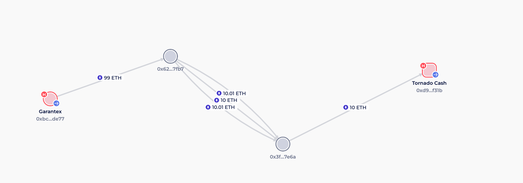 Cụ thể, ví nóng của Garantex đã khởi tạo một giao dịch chuyển 99 ETH, trị giá khoảng 261,000 USD, đến một địa chỉ trung gian.