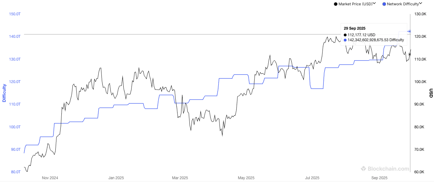 Trong khi đó, độ khó mạng lưới Bitcoin đã tăng lên 142,34T vào tháng 9, đánh dấu mức cao nhất mọi thời đại mới. Sự gia tăng liên tục về độ khó này đồng nghĩa với việc mỗi đơn vị hashrate hiện tạo ra ít BTC hơn, khiến giá băm (doanh thu trên mỗi đơn vị sức mạnh tính toán) giảm xuống.