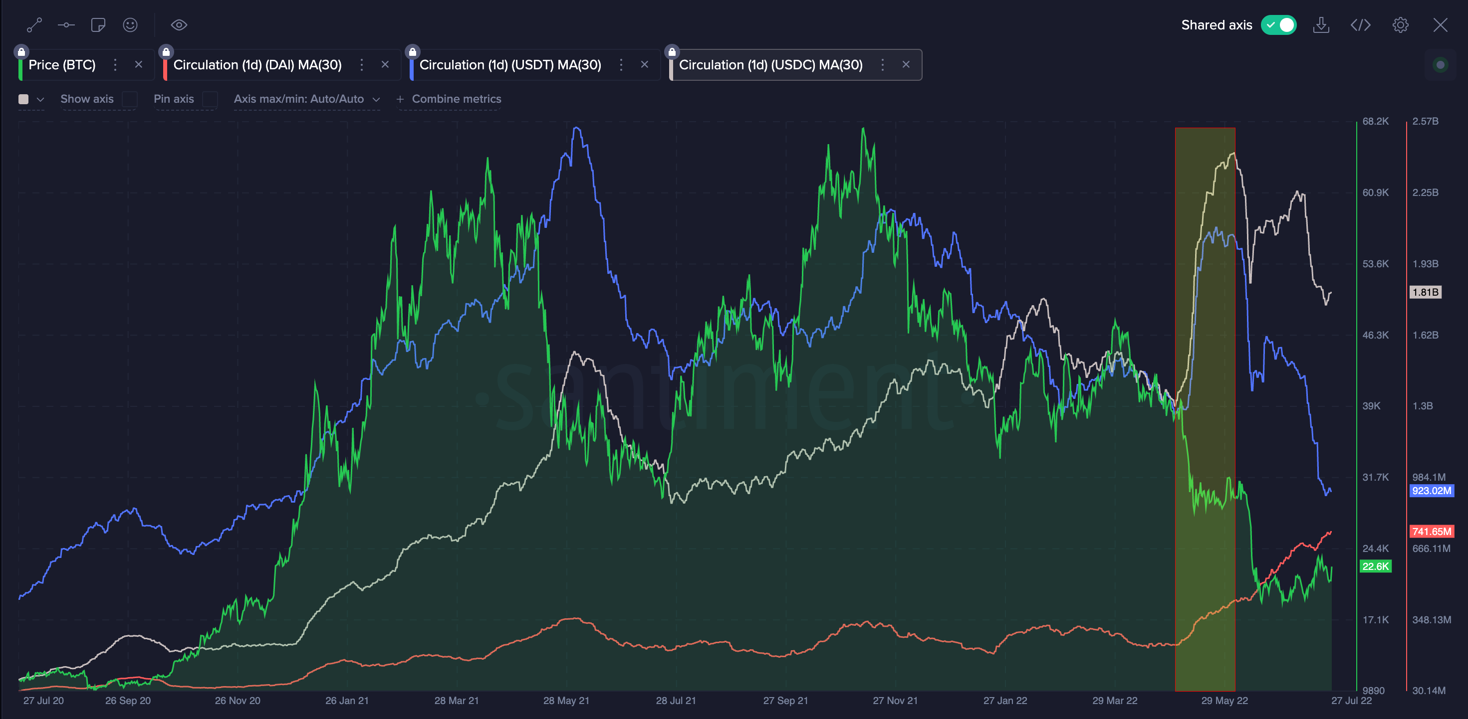 Mô hình tốt nhất có thể là stablecoin vẫn giảm trong thời gian thị trường phục hồi. Như ngày nay. Khi stablecoin chưa tin vào sự phục hồi, bạn nên chờ đợi. Chúng ta có thể đang chứng kiến điều tương tự vào tháng 7 năm 2021, ít nhất là trên hai stablecoin hàng đầu.