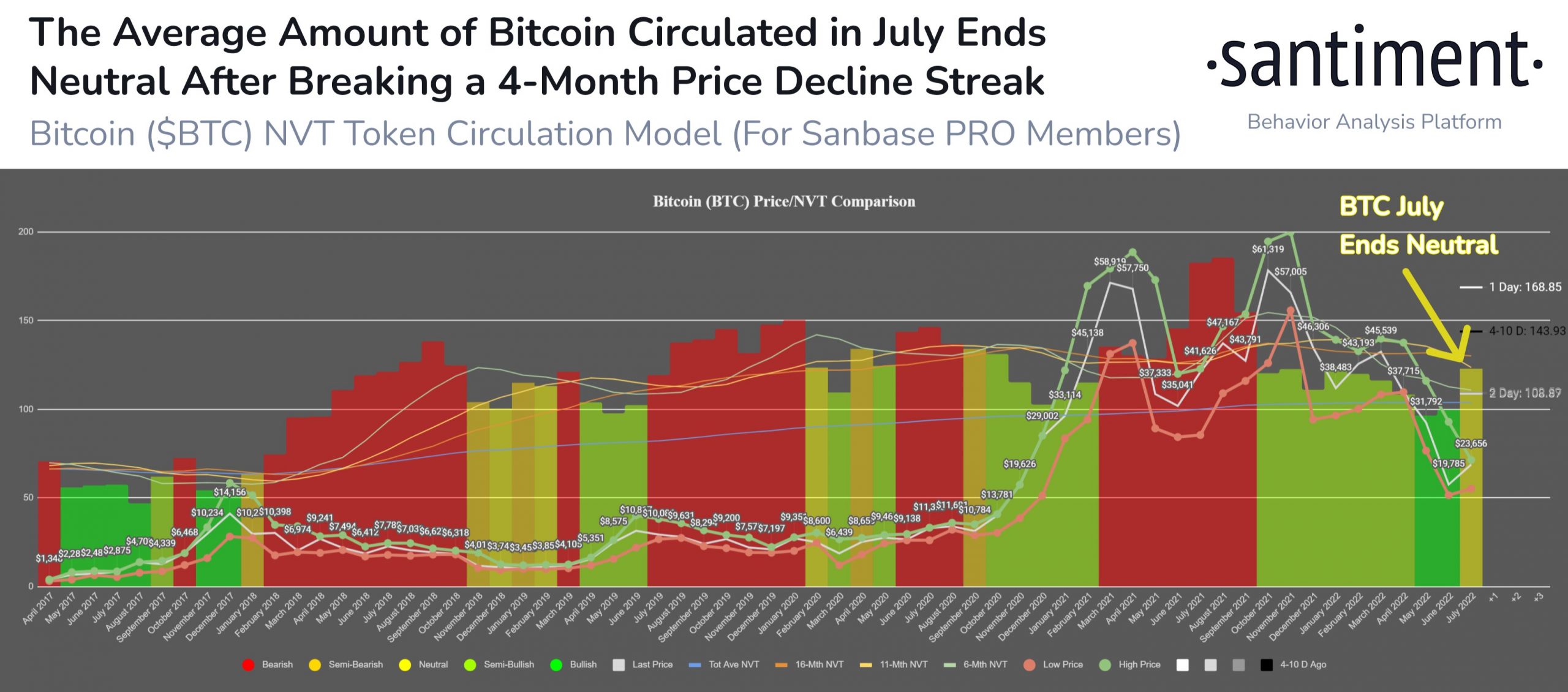 Bitcoin đã tăng 18% trong tháng 7 sau khi sự phân kỳ tăng giá ngày càng tăng của mô hình NVT vào tháng 5 và tháng 6 cuối cùng đã chứng kiến sự phục hồi về giá thành hiện thực. Với tín hiệu trung lập hiện tại khi giá đã tăng và lưu thông token giảm nhẹ, tháng 8 có thể di chuyển theo một trong hai hướng.