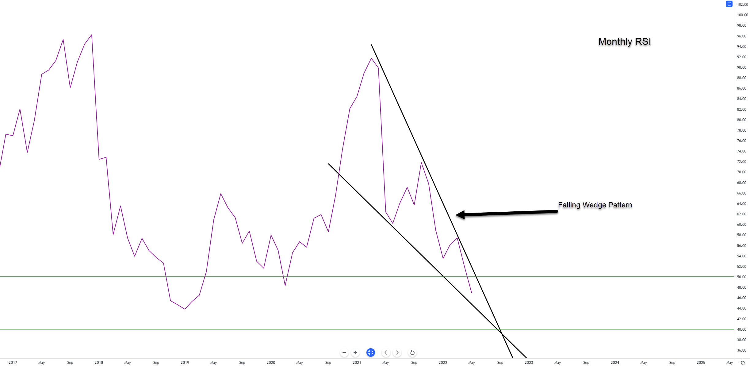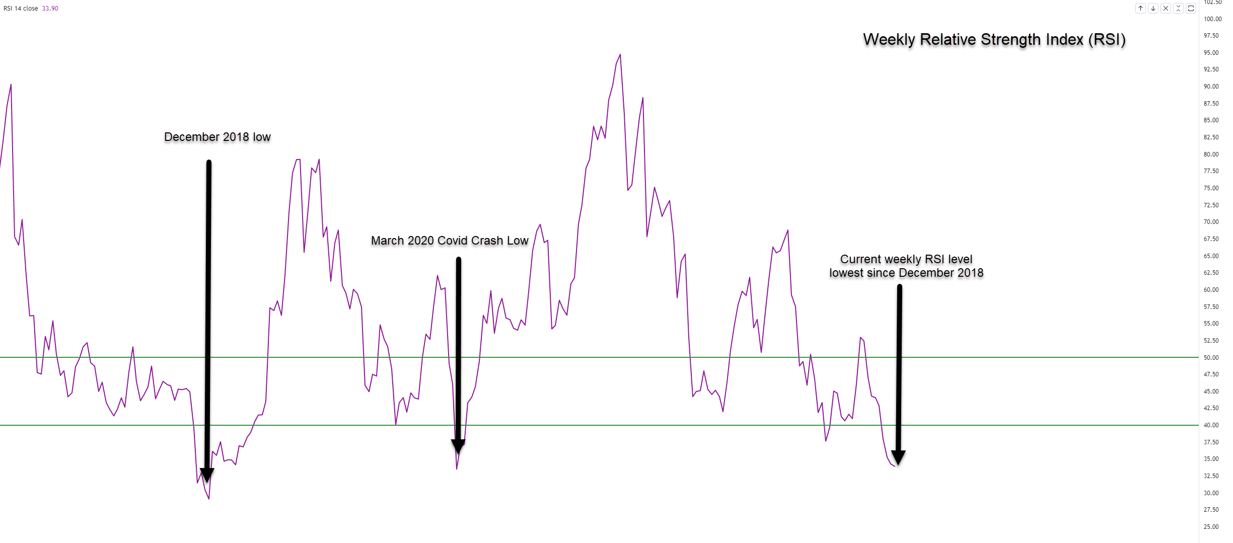 Chỉ báo RSI hàng tuần vẫn ở trong điều kiện thị trường tăng giá, mặc dù nó đang di chuyển dưới cả hai mức quá bán là 50 và 40 – cho đến khi chạm mức 30, cài đặt RSI của thị trường tăng vẫn duy trì. Hiện tại, ở mức 33, mức RSI hàng tuần này là mức thấp nhất kể từ tuần ngày 10 tháng 12 năm 2018 và ngay dưới mức thấp nhất của sự cố COVID-19 vào tháng 3 năm 2020 là 33,48.
