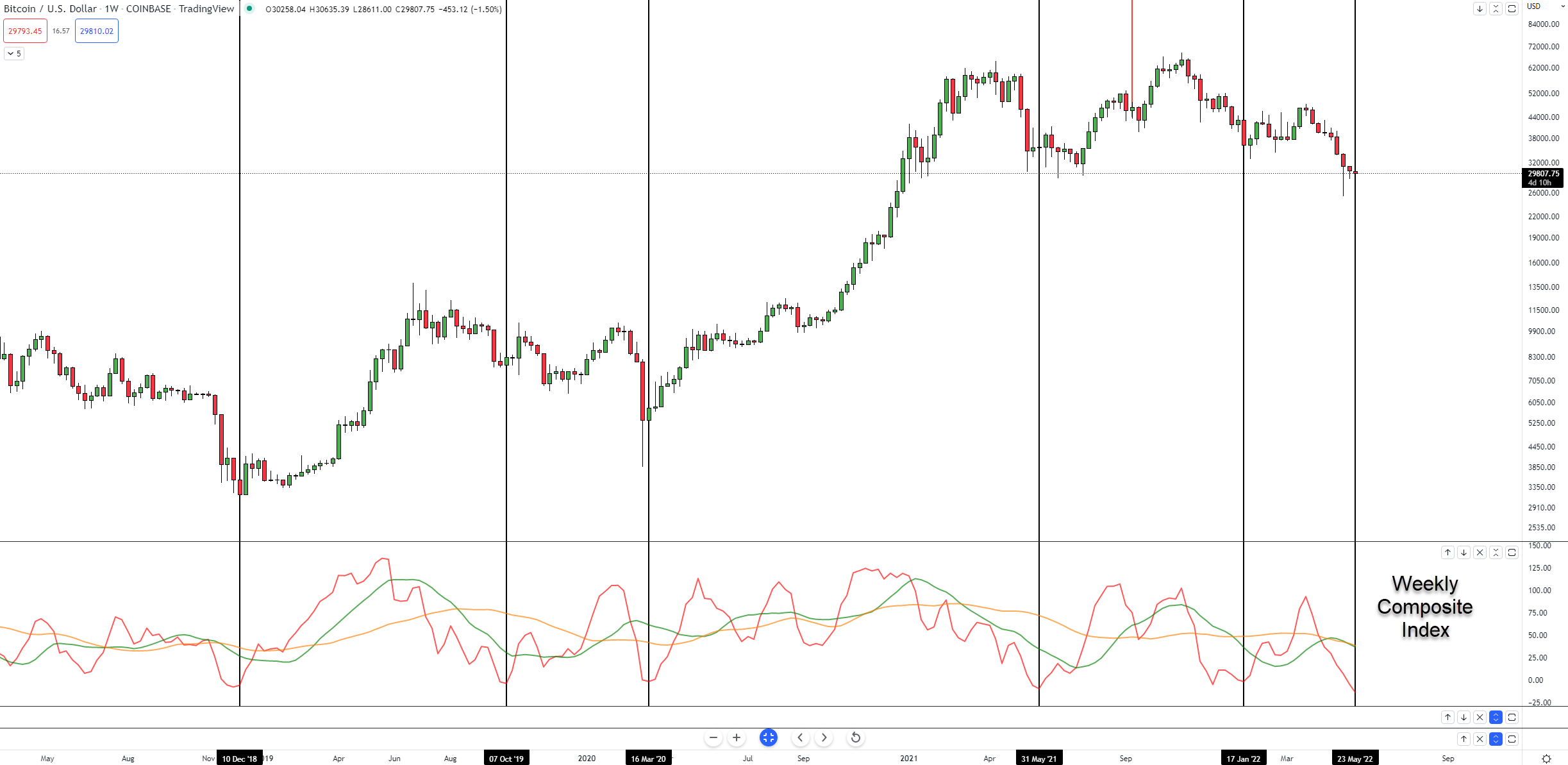 Các đường thẳng đứng màu đen xác định mức thấp nhất trong lịch sử gần đây nhất trong chỉ số tổng hợp hàng tuần của Bitcoin.