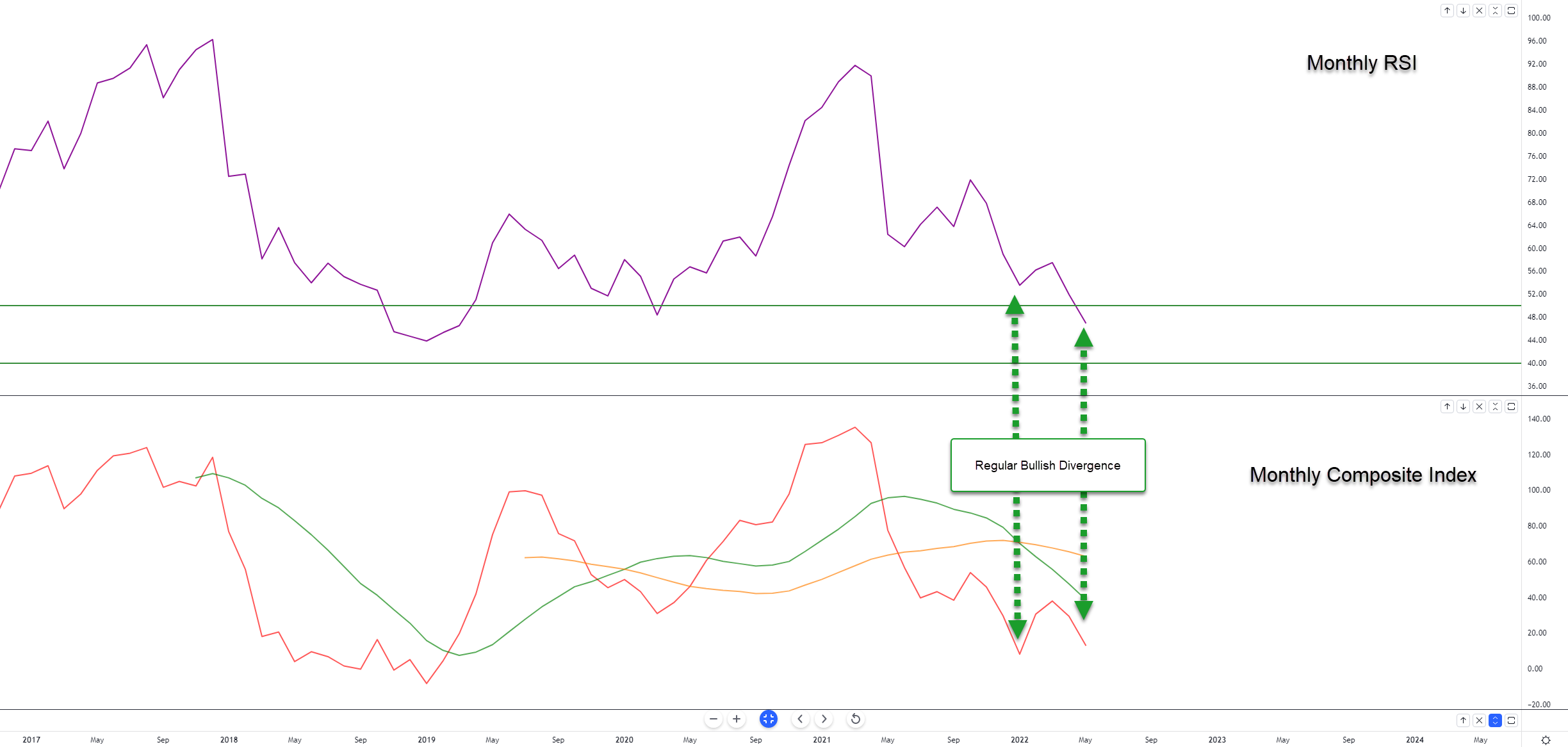 Một sự phát triển chính khác với các bộ dao động của Bitcon là sự phân kỳ tăng thường xuyên giữa RSI hàng tháng và chỉ số tổng hợp hàng tháng. Chỉ số tổng hợp, được tạo ra bởi Connie Brown, về cơ bản là RSI với tính toán động lượng – nó bắt được các chuyển động mà RSI không thể.