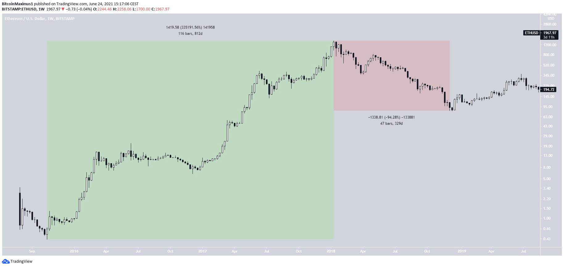 Phong trào tăng tiếp tục trong 812 ngày, dẫn đến mức giá cao nhất mọi thời đại khi đó là 1.420 USD, đạt được vào tháng 1 năm 2018. Trong suốt giai đoạn này, ETH đã tăng rất lớn 335.191%.