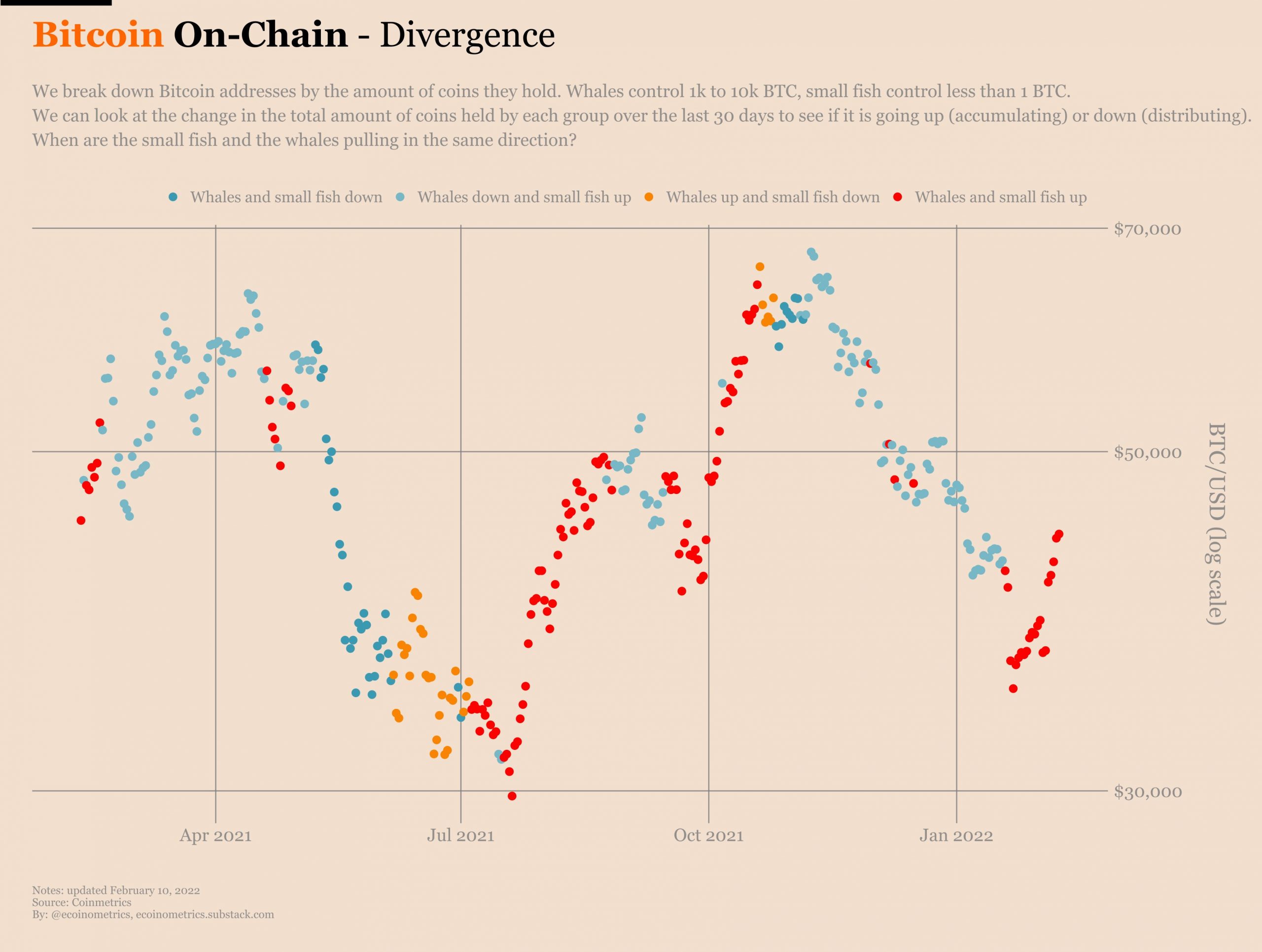 Trong khi đó, Ecoinometrics hiển thị dữ liệu Coin Metrics ở dạng cụm, cho thấy hành vi tích lũy đồng bộ giữa cá voi và cá.