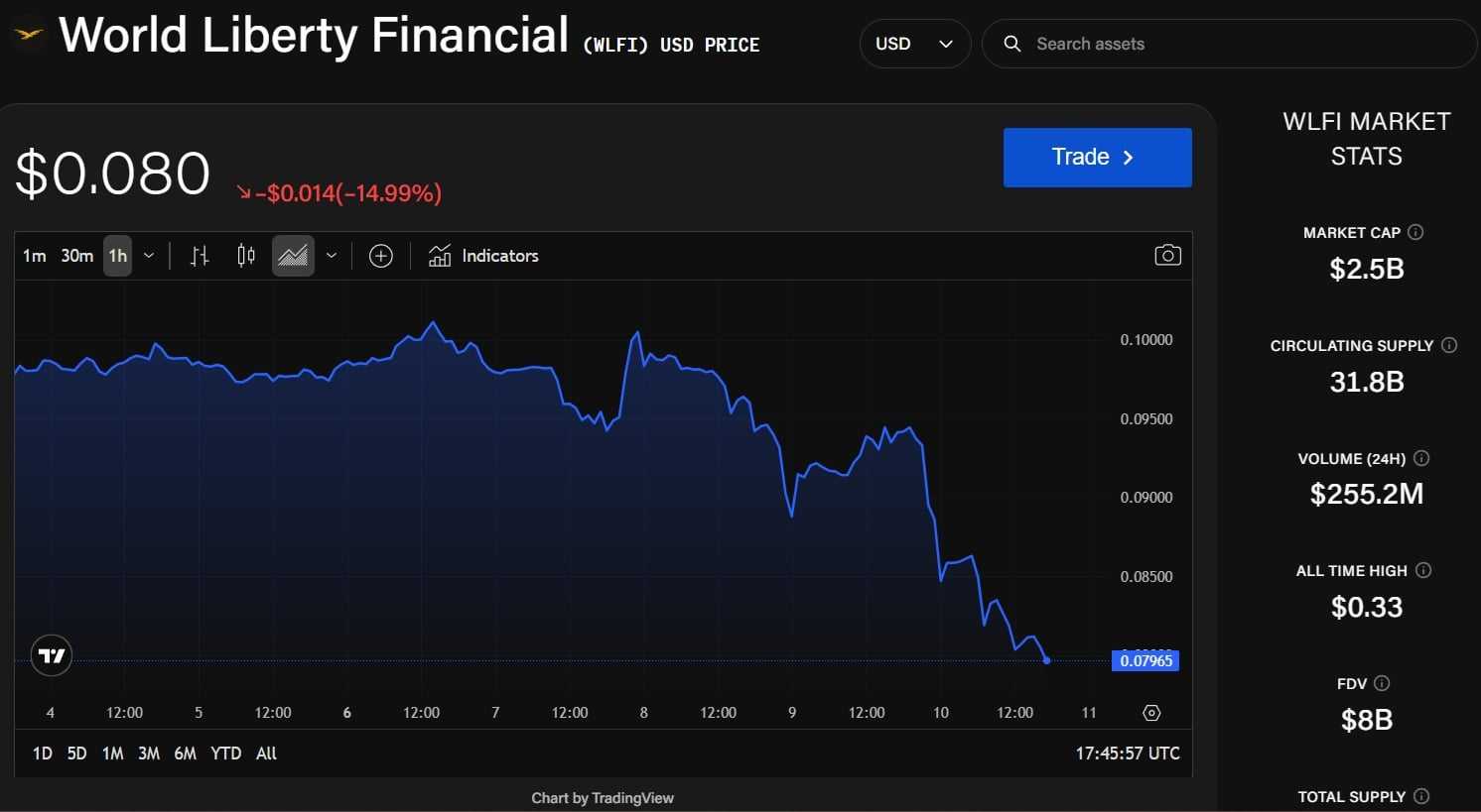 WLFI đã giảm 15% trong 24 giờ qua, đánh dấu mức giảm hơn 74% kể từ khi token này được phép giao dịch lần đầu tiên vào năm ngoái.