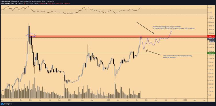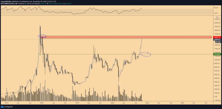Biểu đồ hàng tuần của Bitcoin cho thấy mức $16,000 là vùng kháng cự cuối cùng trước khi có thể kiểm tra mức cao nhất mọi thời đại mới.
