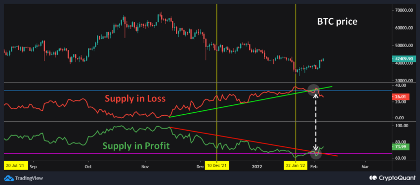 - Sự hội tụ của hai chỉ số này dự báo một đà tăng giá cho Bitcoin. Điều này đã xảy ra vào khoảng những tháng cuối năm 2021. Hiện tại Supply in Loss đã phá vỡ hỗ trợ và Supply in Profit đã phá vỡ kháng cự. Cả hai đang “chớm” hội tụ, dự báo một đà tăng mới cho Bitcoin đã bắt đầu.