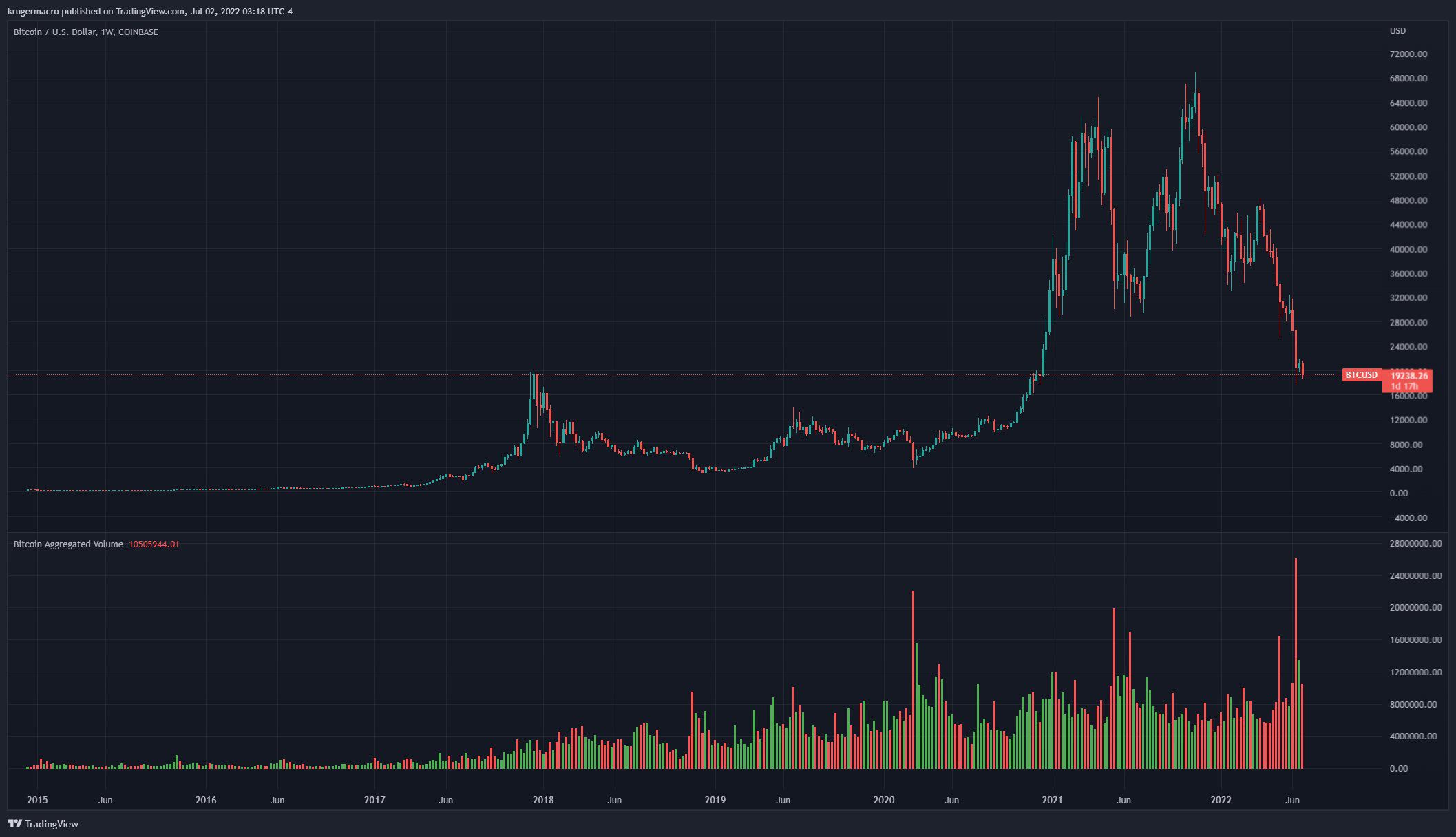 Quan sát mới nhất của Alex Krüger (@krugermacro) cho rằng có rất hiếm thời điểm nào mà khối lượng giao dịch Bitcoin đạt kỷ lục như hiện tại.