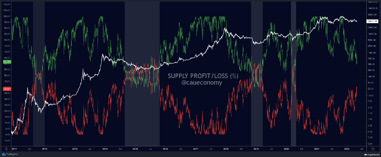 Nếu xét trên tỷ lệ nguồn cung đang lỗ (đường màu đỏ) và đang lãi (đường màu xanh) để làm thước đo ngưỡng chịu đựng tối đa của thị trường trong quá khứ, thì sự suy giảm những tháng qua vẫn chưa là tối đa.