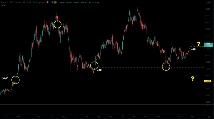 Khi có một biến động mạnh với biên độ lớn trên thị trường giao ngay thì biểu đồ giá hợp đồng tương lai (Bitcoin CME) thường xuất hiện những khoảng trống giá lớn. Bitcoin CME GAP được nhiều người xem như một “điềm báo” vì thống kê cho thấy đến 90% số GAP thường sẽ được lấp.