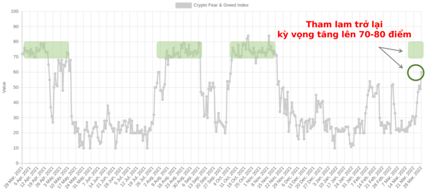 Chúng ta thấy rõ ràng trạng thái này qua biến động của chỉ báo Crypto Fear & Greed Index.