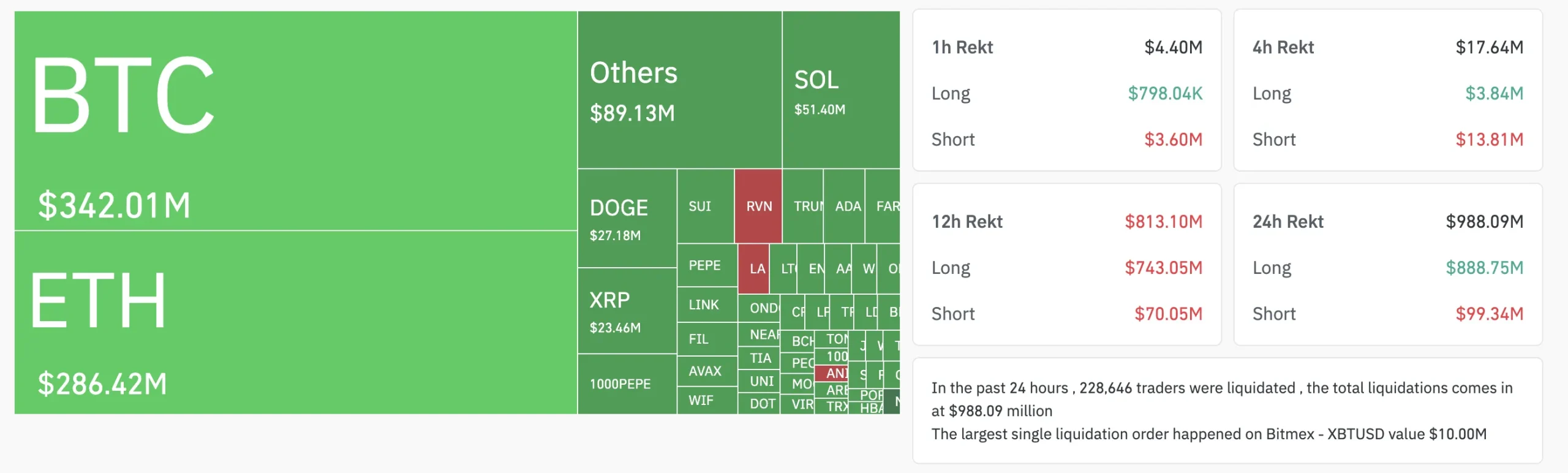 Đợt giảm giá này đã kích hoạt làn sóng thanh lý, khi nhiều vị thế đòn bẩy buộc phải đóng, làm tăng thêm sự biến động. Theo dữ liệu từ Coinglass, trong 24 giờ qua, tổng số thanh lý đạt 988.09 triệu USD.
