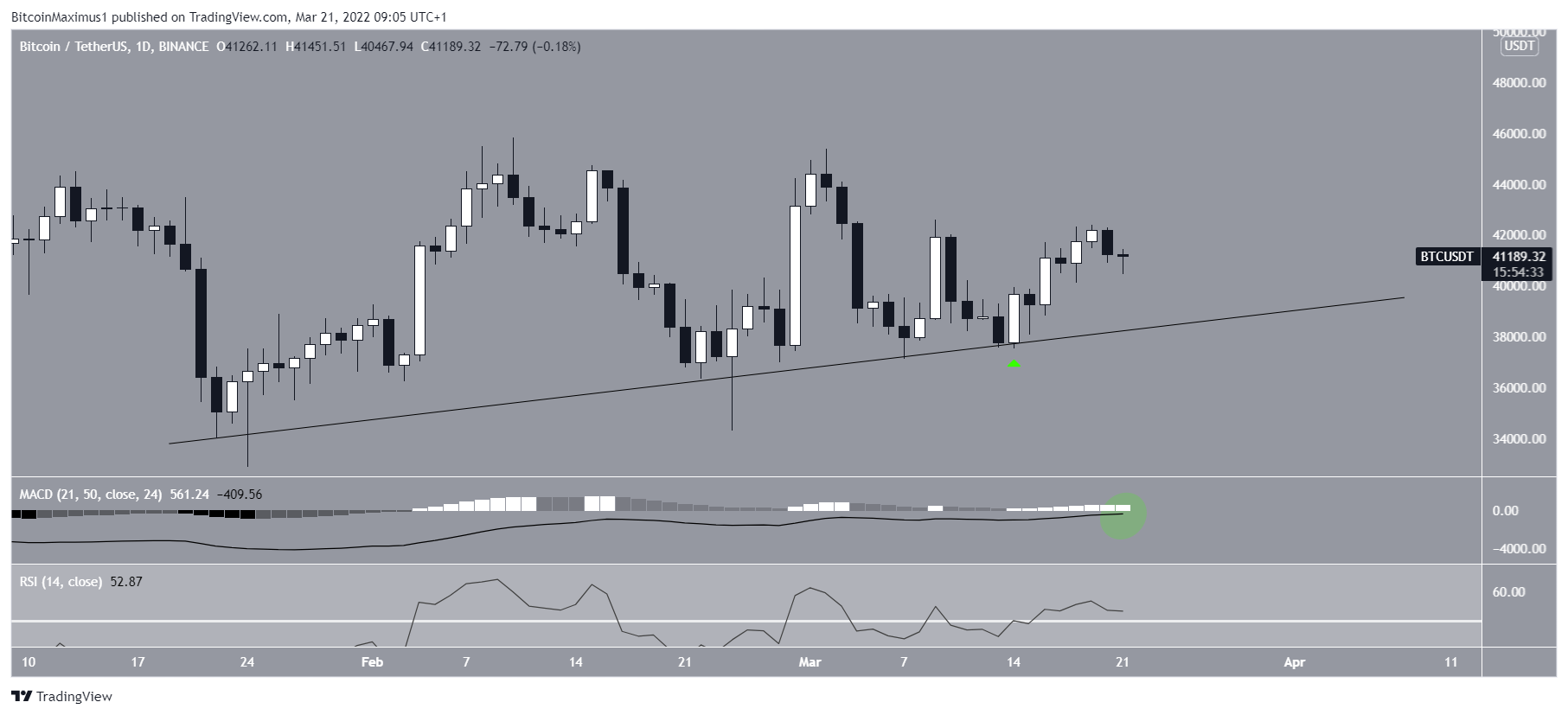 Biểu đồ hàng ngày cho thấy BTC đã giao dịch trên đường hỗ trợ tăng dần kể từ ngày 22 tháng 1. Nó bật lên tại đường này vào ngày 14 tháng 3 và tạo ra một hình nến Bullish Engulfing (biểu tượng màu xanh lá cây).