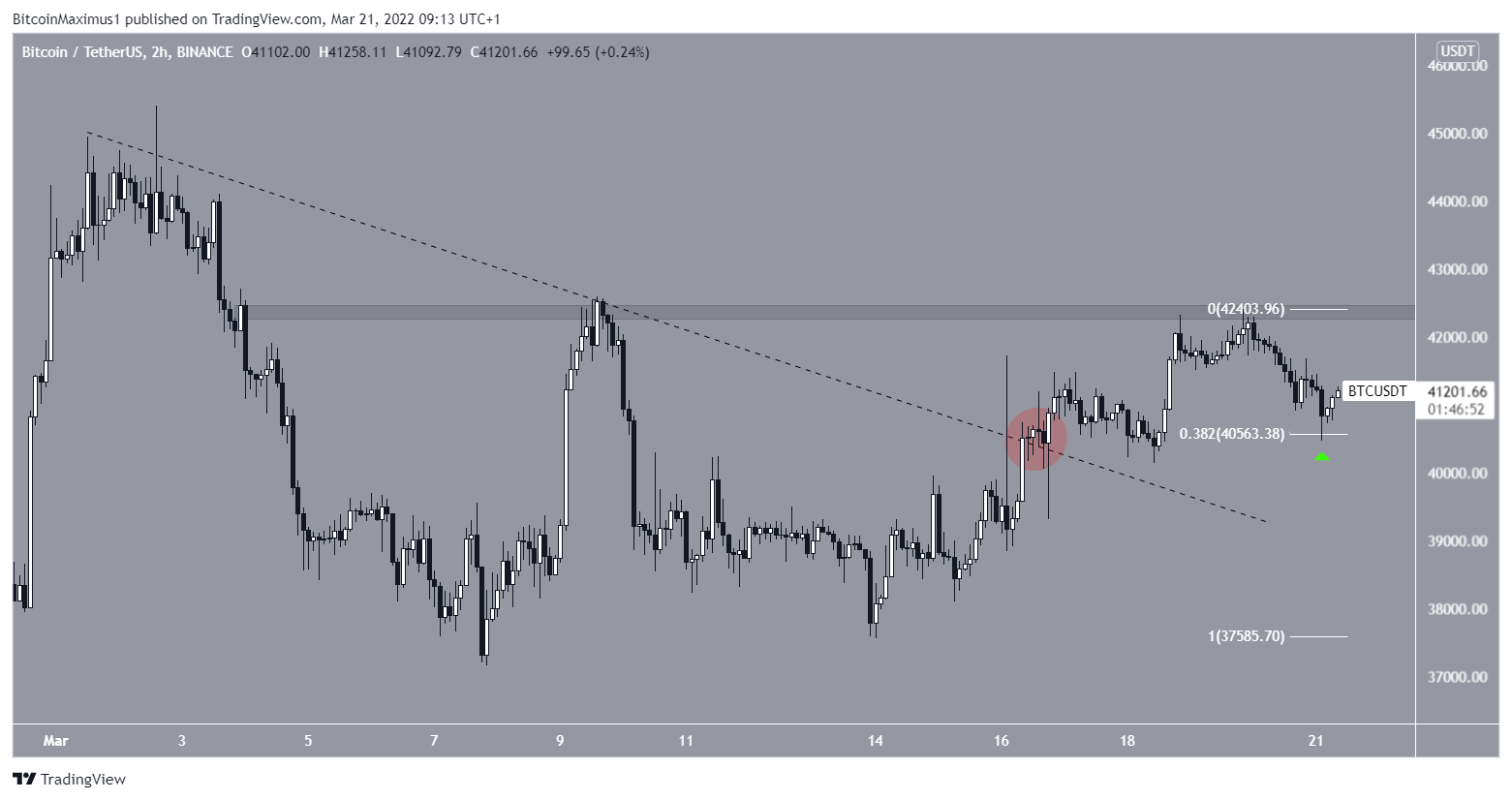 Vào ngày 21 tháng 3, BTC đã bật lên ở mức hỗ trợ thoái lui 0,382 Fib và tạo ra một bấc dài thấp hơn (biểu tượng màu xanh lá cây).