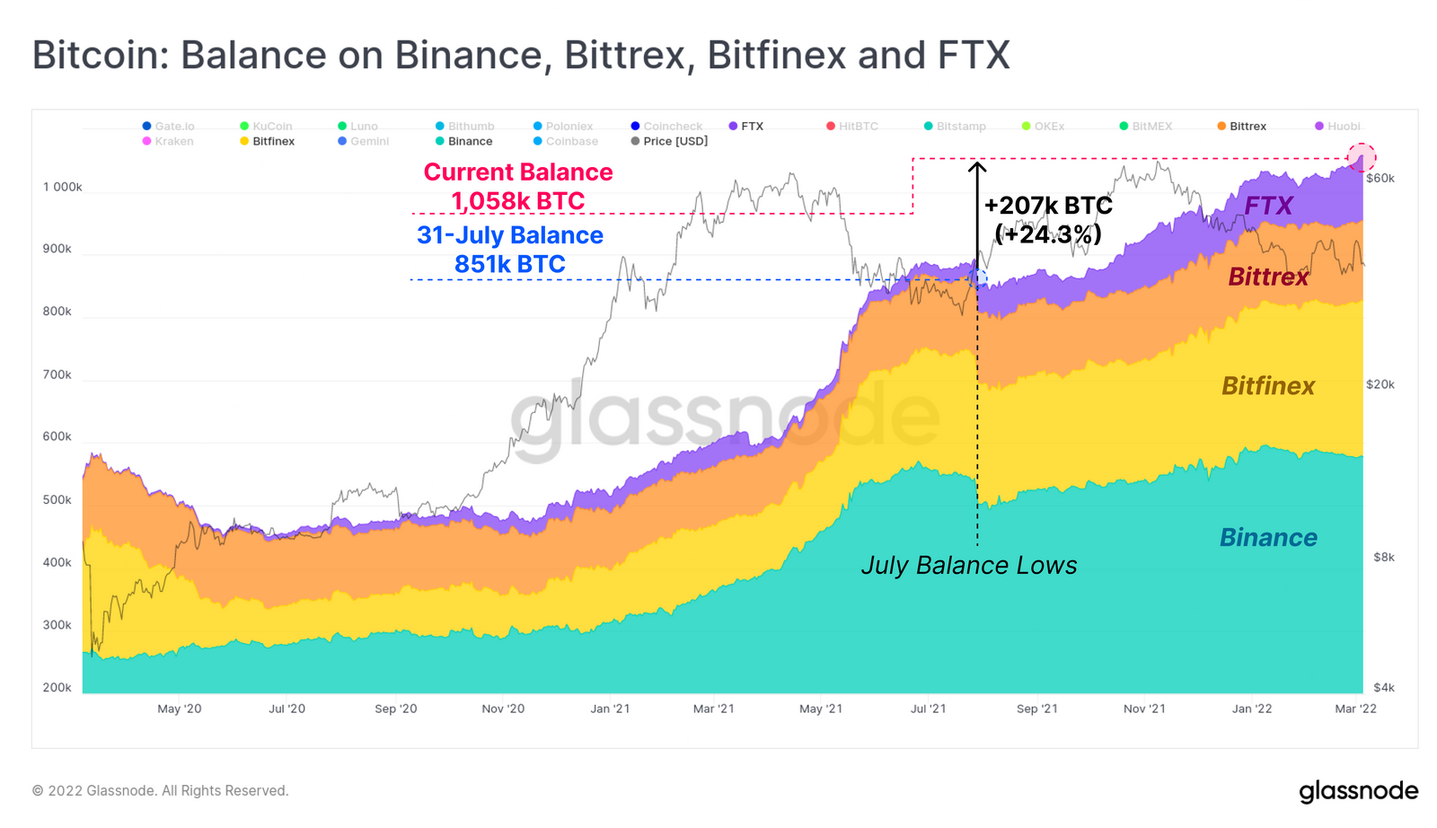 Chỉ có Binance, Bittrex, Bitfinex và FTX đã chứng kiến dòng tiền ròng dương là 207.000 Bitcoin (BTC), theo dữ liệu từ bản tin ngày 7 tháng 3 của công ty phân tích blockchain Glassnode. Trong cùng khoảng thời gian, dòng tiền ròng đã đạt tổng cộng 253.000 BTC từ tất cả các sàn giao dịch khác được theo dõi.