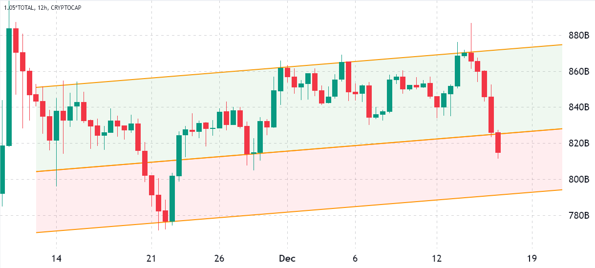 Tổng vốn hóa thị trường tiền điện tử đã giảm 8,1% trong hai ngày qua sau khi không thể phá vỡ mức kháng cự 880 tỷ USD vào ngày 14 tháng 12.