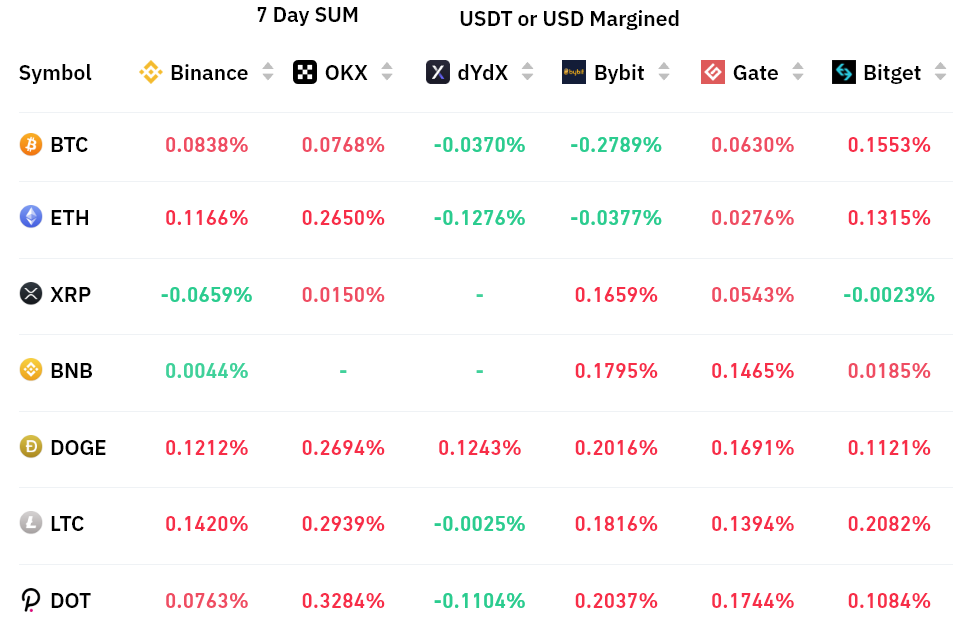 Tỷ lệ tài trợ trong 7 ngày gần bằng 0 đối với Bitcoin và các altcoin, có nghĩa là dữ liệu chỉ ra nhu cầu cân bằng giữa đòn bẩy long (người mua) và short (người bán) trong giai đoạn này.